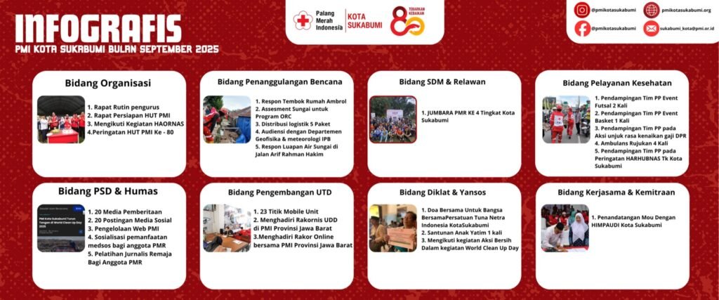 KOTA SUKABUMI– Palang Merah Indonesia (PMI) Kota Sukabumi merilis capaian kegiatan kemanusiaan yang telah dilaksanakan sepanjang bulan Agustus 2025. Melalui