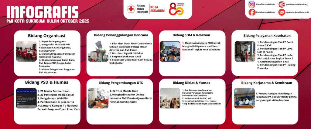 Kota Sukabumi- Palang Merah Indonesia (PMI) Kota Sukabumi mencatat beragam capaian kegiatan dan Pelayanan kemanusiaan sepanjang bulan Oktober 2025. Berbagai