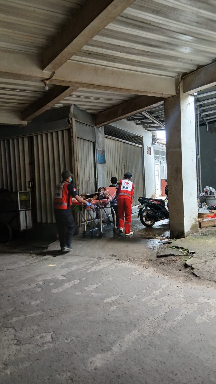 Proses evakuasi dilakukan oleh dua petugas PMI yang dilengkapi dengan peralatan medis dasar. Dengan sigap dan hati-hati, mereka memindahkan pasien menggunakan tandu, memastikan kondisi vital tetap stabil, serta menyiapkan tabung oksigen sebagai langkah antisipatif selama perjalanan.